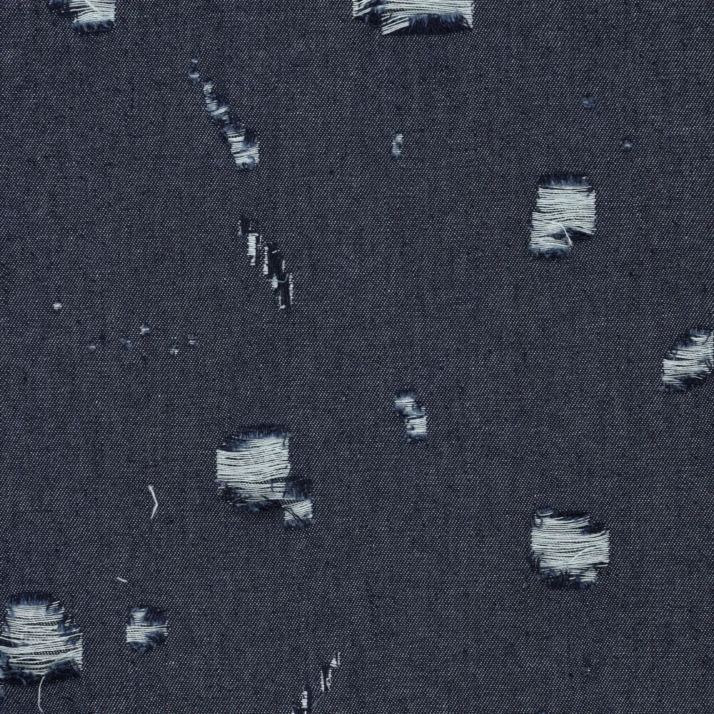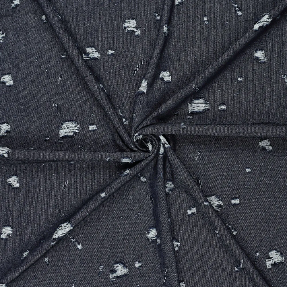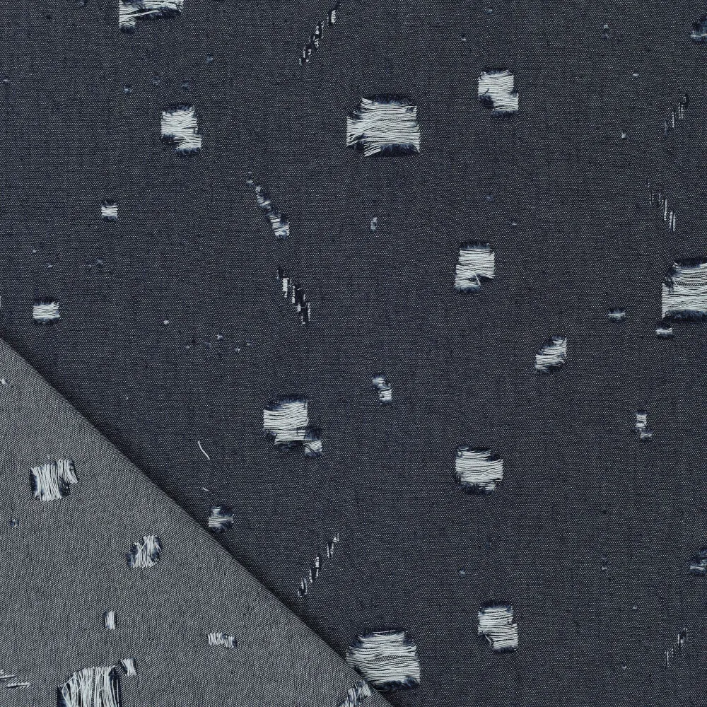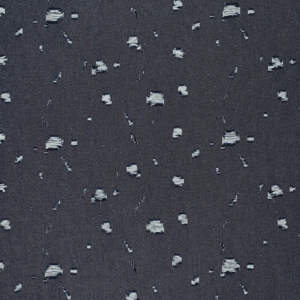 In deze jeansstof zitten vooraf gemaakte gaten voor een ripped effect. Helemaal hip tegenwoordig!